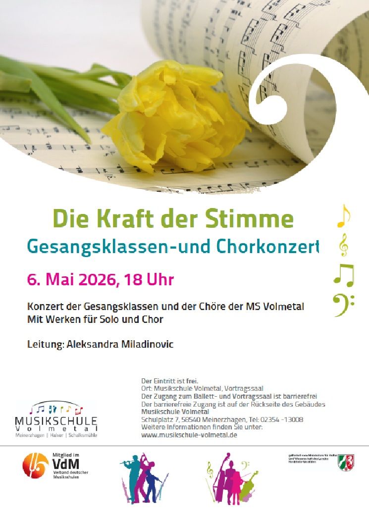 Am Mittwoch, 06. Mai 2026, zum Konzert der Gesangklassen und Chöre der Musikschule Volmetal. Beginn: 18.00 Uhr, Ort: Ballett- und Vortragssaal der Musikschule in Meinerzhagen